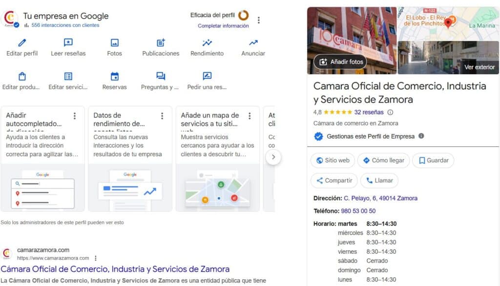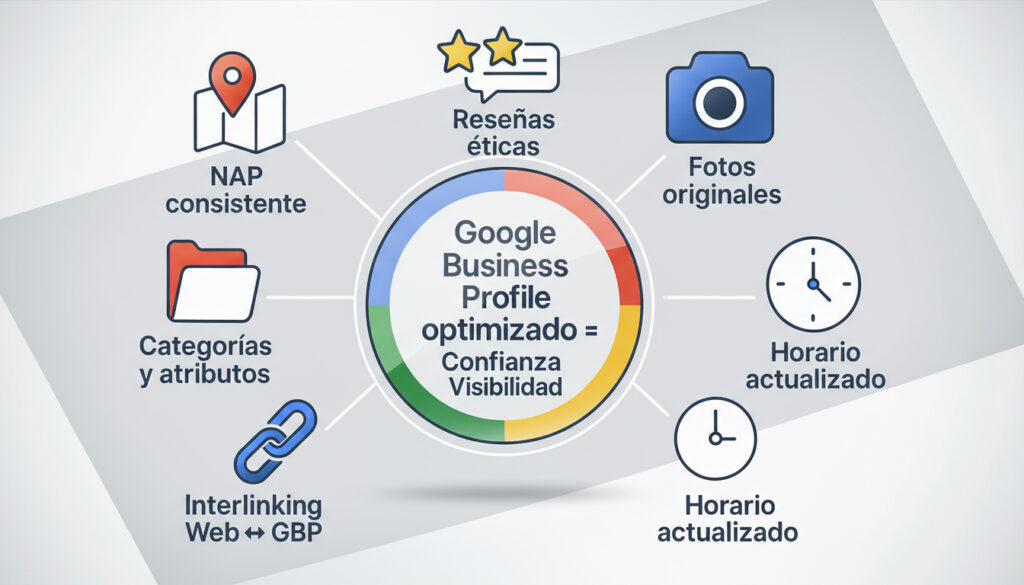 El Perfil de Empresa muestra nombre, dirección, teléfono, horario, reseñas y fotos. Reclamar la ficha te da control total, mejora confianza y activa señales de relevancia, distancia y prominencia.