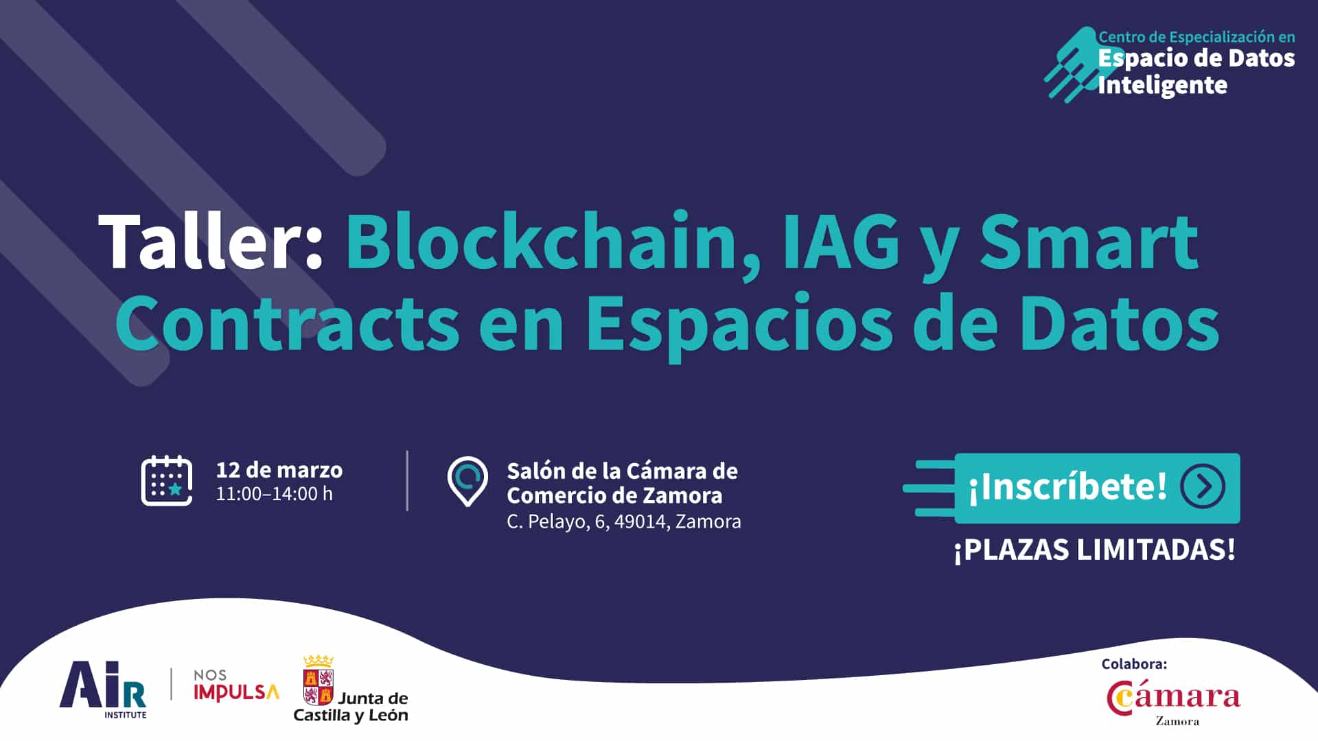 El próximo 12 de marzo, de 11:00 a 14:00 horas, la Cámara de Comercio de Zamora (C. Pelayo, 6) acogerá el Taller Práctico: Blockchain, IAG y Smart Contracts en Espacios de Datos (I Edición), organizado por el Centro de Especialización en Espacio de Datos Inteligente, proyecto coordinado por AIR Institute.